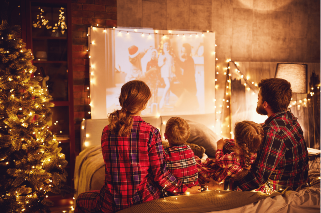 Transform your living room into a private cinema complete with homemade popcorn, hot chocolate, and all your favorite holiday films.