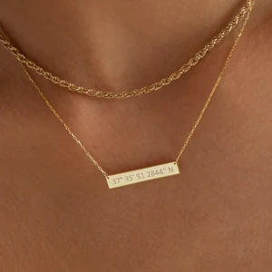 Delicate gold necklace with coordinates engraved on pendant – “personalized coordinate jewelry valentine gift